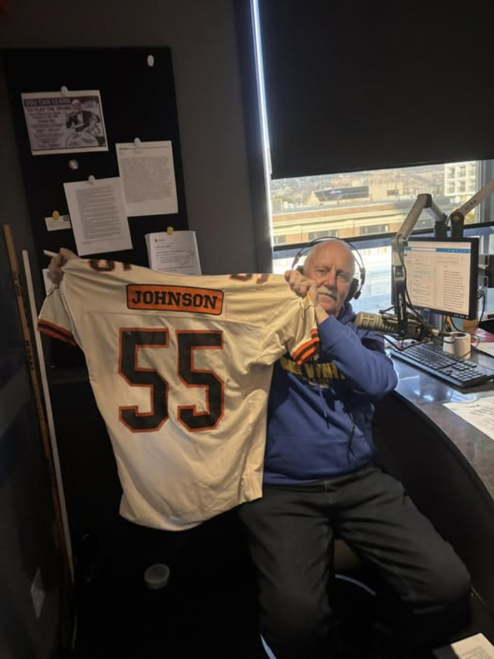 Phil Johnson is calling it a career on the early edition on AM1150. and to thank him for his support of the Okanagan Sun all those years the team presented him with a jersey withh 55on it. The 55 signifies the number of years he was in broadcasting. Congratulations on a great career and enjoy retirement