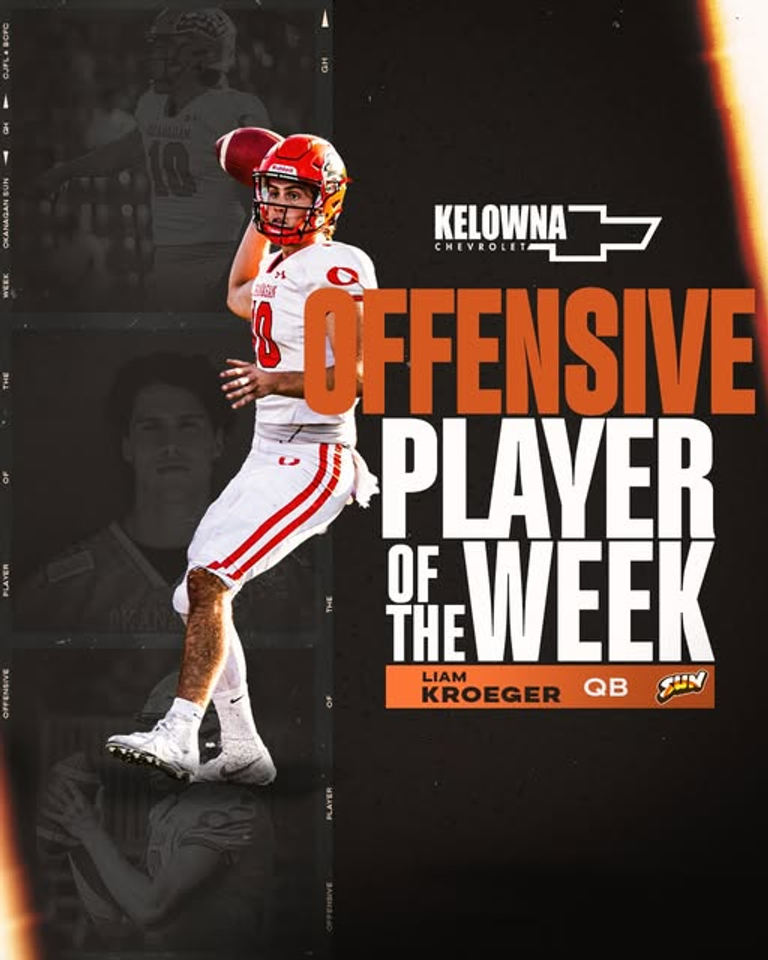 Week 12 in the BCFC saw @okanagan_sun quarterback @liam.kroeger throw a lot against the @kamloopsbroncos . On the day, Liam completed 36/55 of his passes for 429 yards and 6 TD passes. He also tied the Sun record for most attempts in a game with 55, as well as tied his own team record he set earlier in the season with 36 completions. He also became the second player in BCFC history to throw 6 TD passes in a game twice in the same season. On top of that he also set a Sun record for regular season completion percentage (67.7%) breaking the old mark of 63.5%. Lastly Liam had 191 completions on the season breaking the previous Sun record of 168.