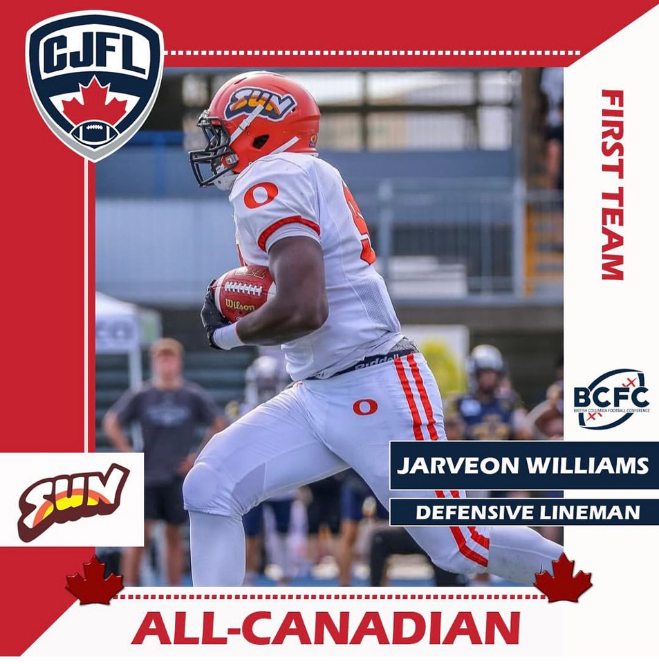 Jarveon Williams - Okanagan Sun – he collected 11 sacks, 14 tackles, returned a fumble 55-yards for a touchdown, knocked down four passes and forced a fumble