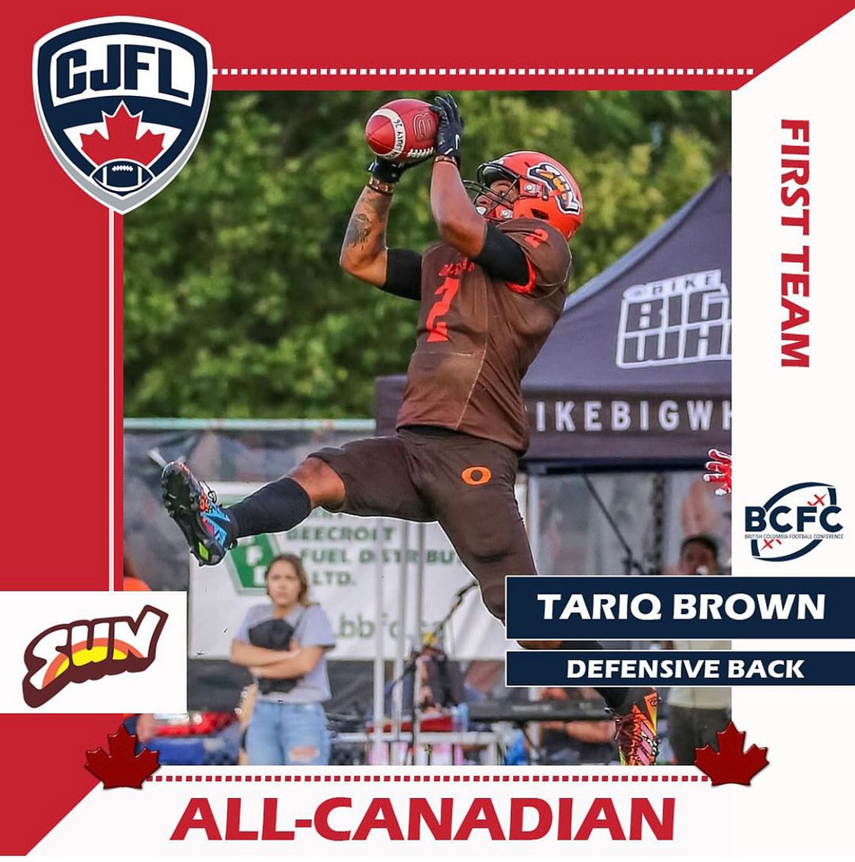 Tariq Brown – Okanagan Sun - led the Conference with seven interceptions, returning two for a touchdown, had 19 tackles, 5 assists, added a sack, 3 knockdowns, forced a fumble and recovered one